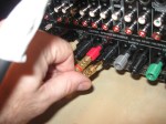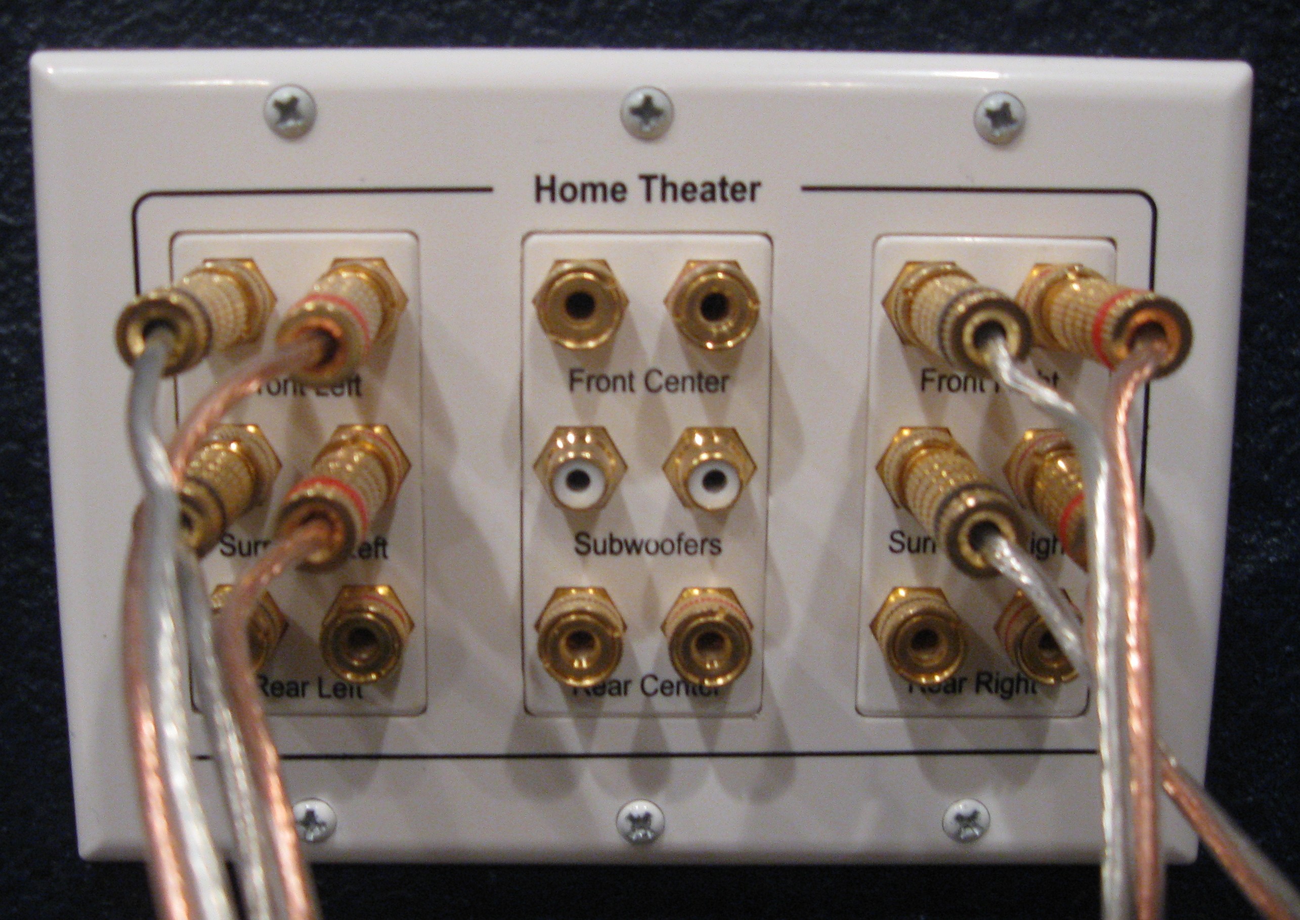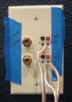 Speakers: I had already made my own short cables with banana plugs on the ends (see how in Part Four). I plugged them into the respective jacks on the back of the receiver and into the jacks on the speaker wall plate.