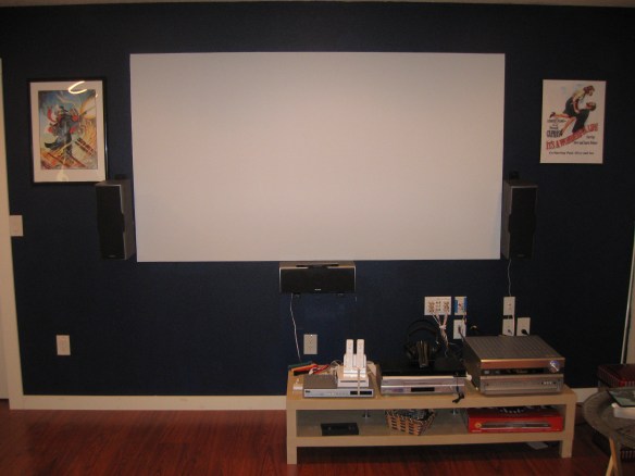 For the final set up of all the components, I had been waiting for the repair of my Onkyo receiver. In the meantime I set up the theatre with an older receiver that did not have HDMI connections. That means I could not connect the receiver to the projector. I had to connect the HDMI cable directly to the DVD player. To watch TV, I had to switch the cable over to the tuner box. The Wii, which we also use to stream movies on Netflix, was connected to the PJ with a long composite cable, rendering a picture that varies from acceptable to wretched.