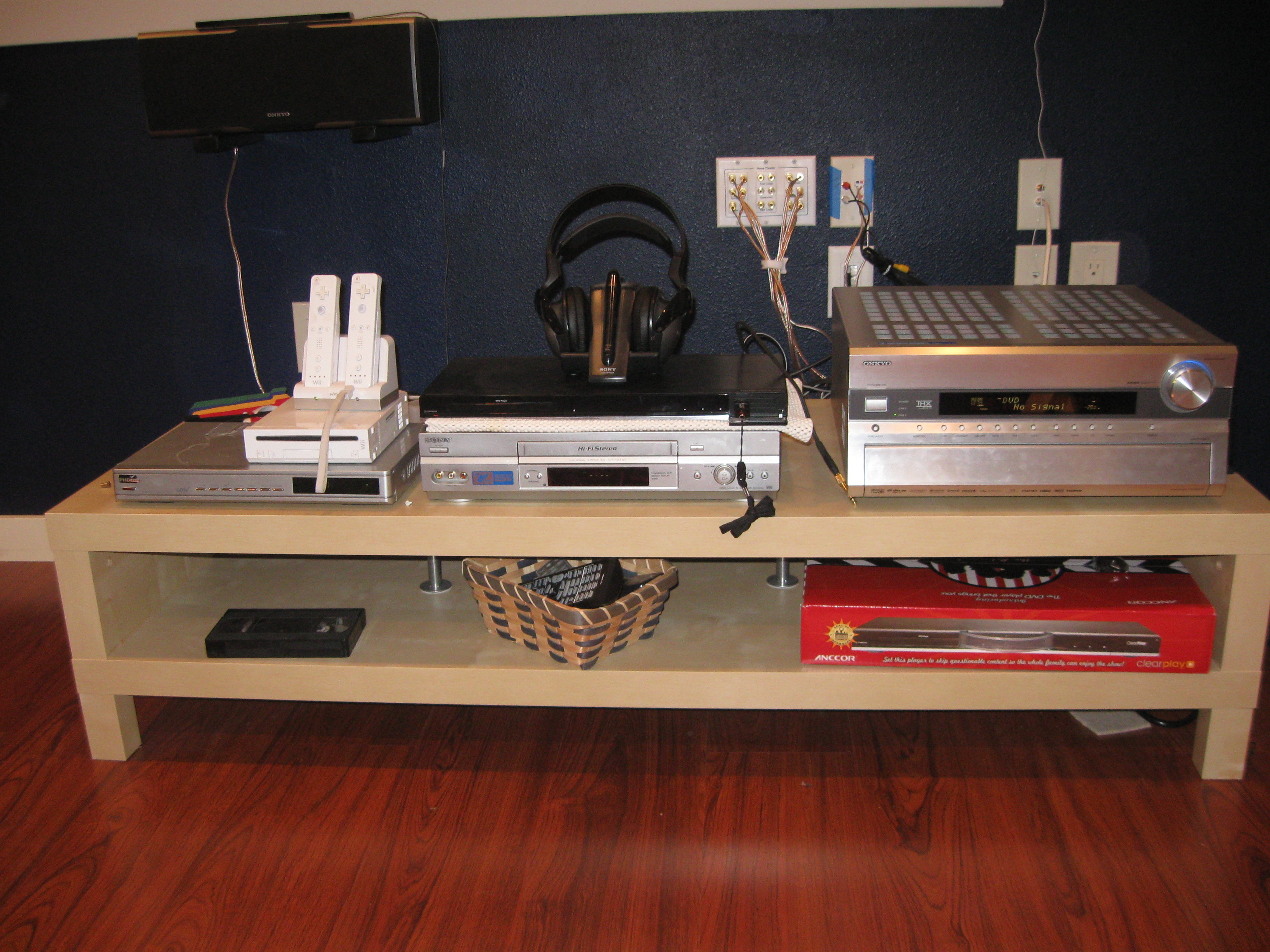 Wii Game Console: Connected to the receiver via Component (red/blue/green) for picture and stereo RCA (red/white) for audio. The top of the center speaker was the perfect location for the